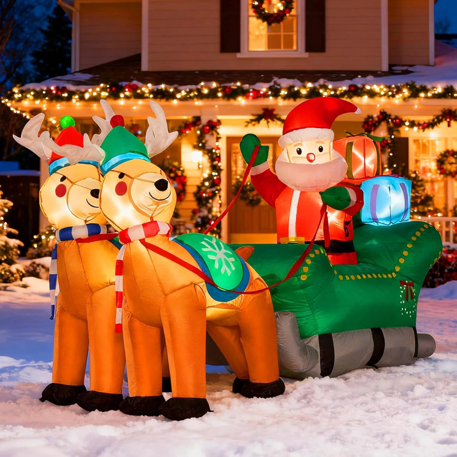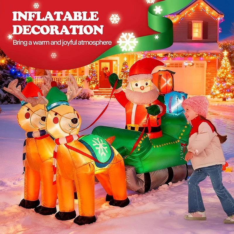 7FT Inflatable LED Santa Claus Reindeers W/ Sleigh Christmas Yard Decoration